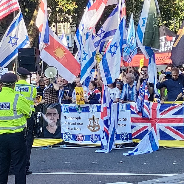 On the pro-Palestinian side, there were a couple of scrawled ‘suspect’ placards which referred to the ‘Intifada’ and ‘Palestine Action.’ Another black flag showing Arabic script was deemed on ‘X’ to be that of ISIS. As has been pointed out, it was in fact a common religious script. Deplorable, however, was the defacing of the Battle of Britain memorial located on the Victoria Embankment by plastering it with Palestine stickers.