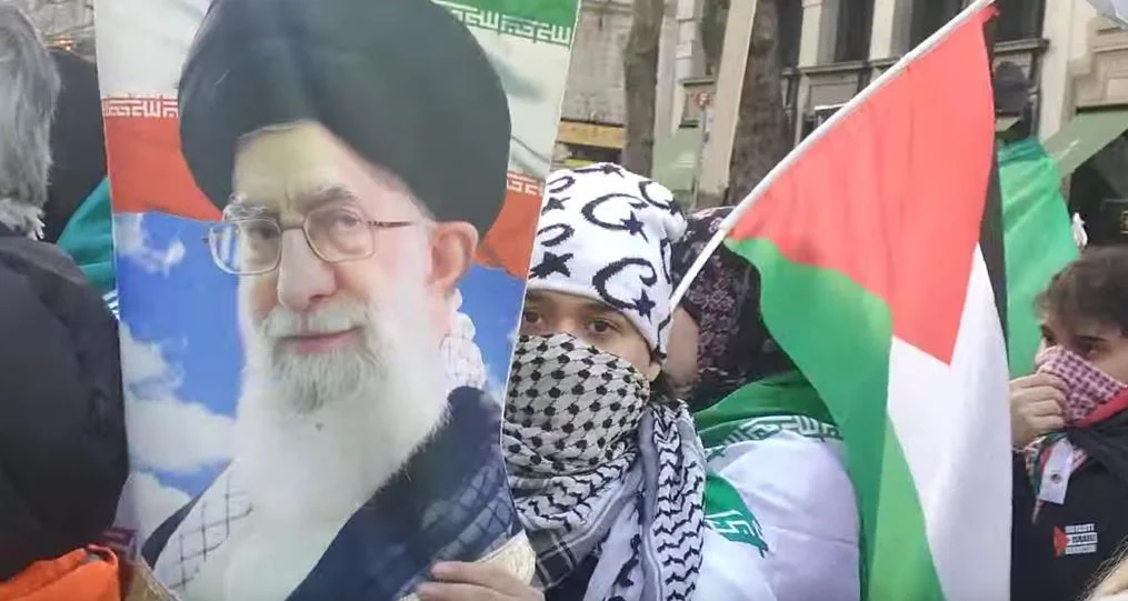 Around 200 Stop the Hate activists and supporters were again located behind barriers in the Aldwych; these numbers appeared down on previous occasions but they were in possession of an extremely loud system and as the PSC march appeared, this was put to good use. An innovation was a raised screen which was split into two; one half showed scenes from the streets of Iranian cities as the security forces murdered thousands; the other murderous scenes from the October the 7th massacre of Israelis by Hamas.