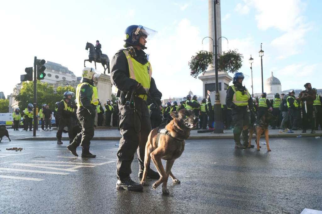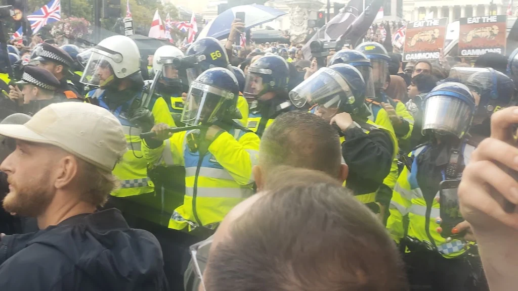 Last weeks protest linked to Palestine Action saw a number of officers assaulted in and around Parliament Square. On Saturday officers were forced to don NATO helmets due to the number of missiles thrown in both their direction and the direction of anti-racist groups. 26 officers were injured, four seriously including one who was knocked unconscious.