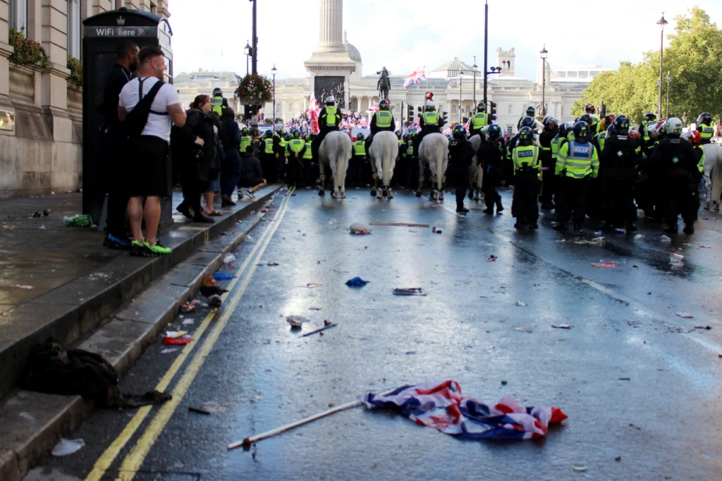 However, the eventual safe extraction of the anti-racists was a masterclass. The several thousand began to move as a group up Whitehall towards Trafalgar Square escorted by police. UTK supporters were blocked by carefully placed serials of officers in full riot gear as the anti-racists turned left into Cockspur Street and away from Trafalgar Square. A group of three UTK supporters waving union flags at the procession were ignored. The tactics used in the extrication of several thousand through hostile opposition closely resembled those seen at high- risk football matches.