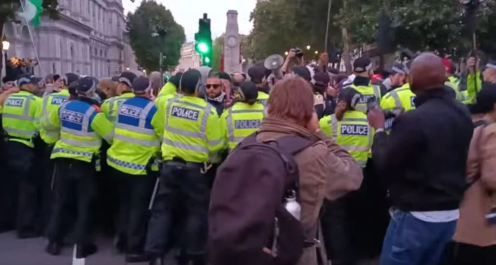 As proceedings were winding down in Trafalgar Square, I made my way to Downing Street. On the previous Thursday, unbeknown to me, a pro-Palestine protest took place as a reaction to the ‘Greta Thunberg flotilla’ being intercepted by the Israeli navy. This protest not only caught me unawares but also the Met. The volatile crowd at one stage forced their way through a police line and forty arrests were made including six for assaulting police.