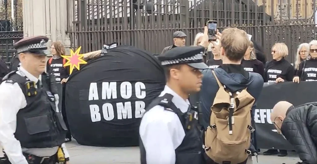 The protest was concluded by 1PM but, interestingly, other events were ongoing including by a small group dressed in black T-shirts showing the letters ‘AMOC.’ It would seem that the “AMOC protest group” is not a formal, standalone organisation with that name; rather, according to research via Ai, “AMOC refers to the scientific concept of the Atlantic Meridional Overturning Circulation, and protests using this term are climate activist actions aimed at raising awareness about the potential collapse and catastrophic impacts of this ocean current system.”