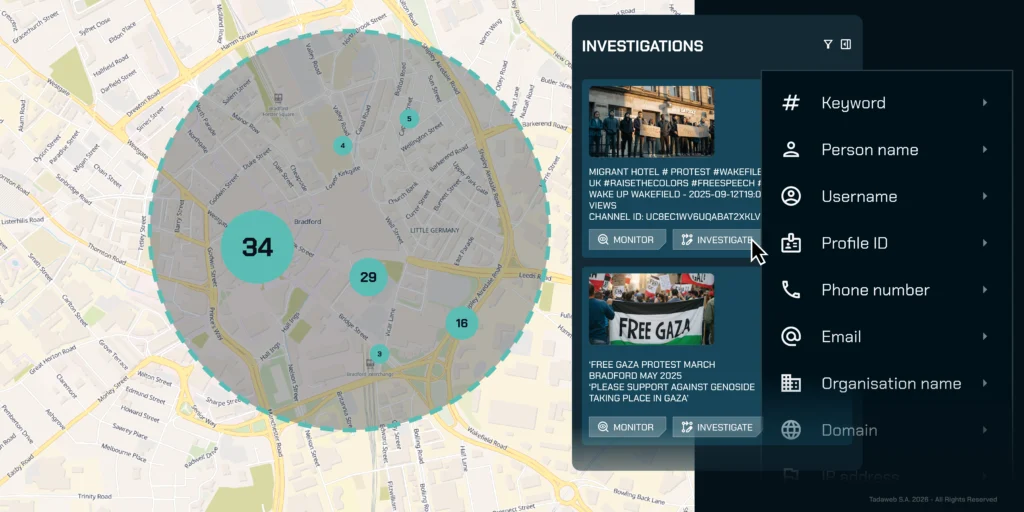 Following a robust methodology, embedded into a dedicated platform, can help you make tremendous efficiency gains. Tadaweb helps you to do so easily and with confidence, by automating your collection and assessment process. Starting from our secure browser, you can identify keywords, selectors and websites of interests, then pivot to social media and relevant online communities to map potential threats. Once the initial threat assessment into group Y has been done, you can review public posts and events to anticipate violent activities, and ensure preventive monitoring based on multiple inputs, including geolocations. Any information of interest can then be saved to evidential standards, and you can iterate on your intelligence collection cycle within a single centralized space.