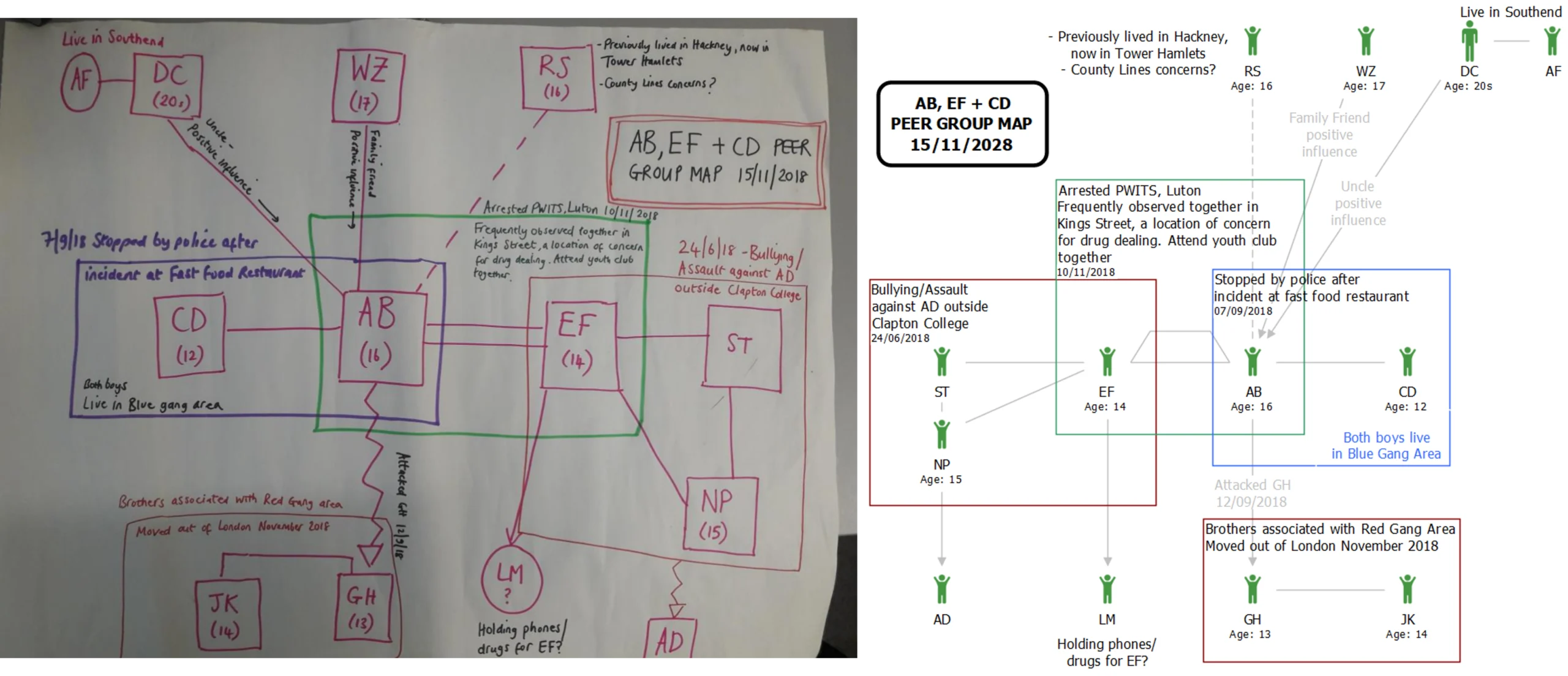 The illustration above shows a chart taken from the Contextual Safeguarding Network’s Peer Group Mapping Guidance, alongside the same chart rebuilt in i2 Analyst’s Notebook, demonstrating highly compatible notation affordances.
