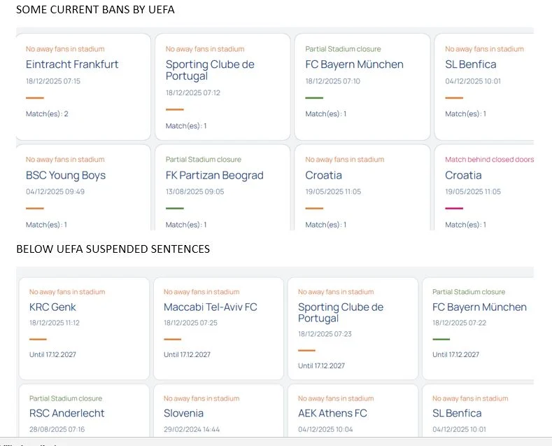 Local authorities in addition to UEFA, impose travel bans of visiting supporters. French authorities issued a total travel ban for PSV Eindhoven supporters to and within Paris for a Champions League game, citing past disturbances.